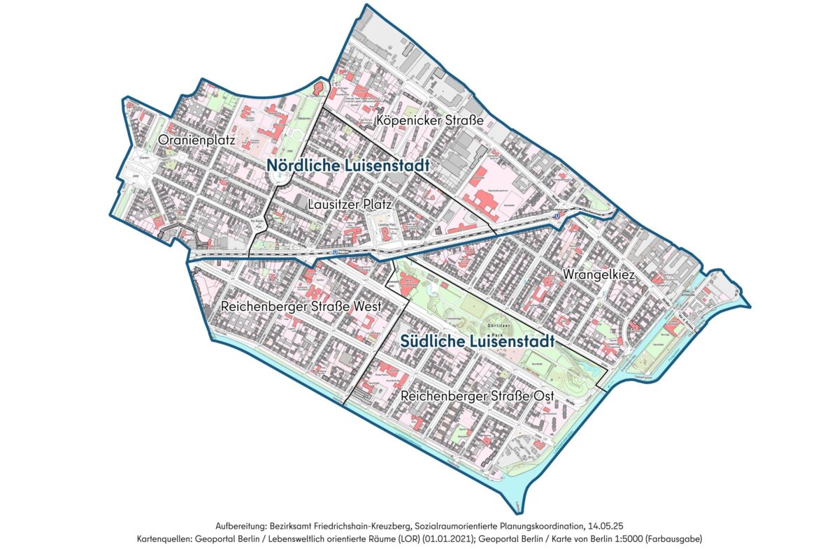 Zu Kreuzberg Ost gehören sechs Planungsräume. In der Nördlichen Luisenstadt liegen die Planungsräume Oranienplatz, Lausitzer Platz und Köpenicker Straße. In der Südlichen Luisenstadt befinden sich Reichenberger Straße West, Reichenberger Straße Ost und der Wrangelkiez.